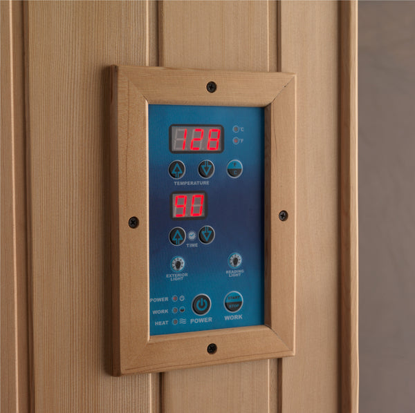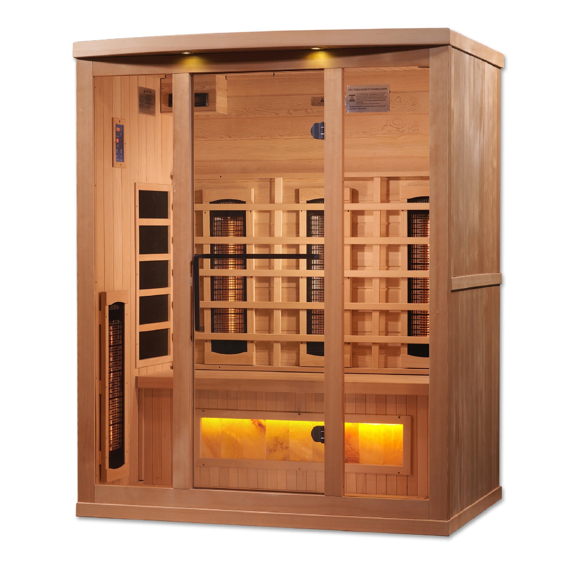 Discover the epitome of relaxation and rejuvenation with the new Golden Designs "Reserve Edition" 3-Person Full Spectrum Sauna, now enhanced with a unique Himalayan Salt Bar feature. This sauna, designed to comfortably accommodate three individuals, is a fusion of traditional craftsmanship and modern technology. Crafted from natural reforested Canadian Hemlock wood, its beauty is accentuated by the exterior ambient lighting and a bronze privacy tempered glass door. Dive into a world of serenity with the Bluetooth and MP3 auxiliary connection, complemented by built-in speakers. The interior LED control panel and oversized reading/chromotherapy lighting system set the ambiance for a perfect relaxation session. With a total of 8 IR Emitters, including 3 Carbon PureTech™ Near Zero EMF Heating Panels and 5 Near Infrared Heating Elements, you're guaranteed a therapeutic experience. The unique addition of Himalayan Salt Bars, positioned both under the bench and above the heaters, not only enhances the sauna's health benefits but also adds a touch of luxury. Easy clasp-together assembly ensures that this masterpiece is not just a health investment but also a statement piece for your home. Experience the future of wellness with the "Reserve Edition".